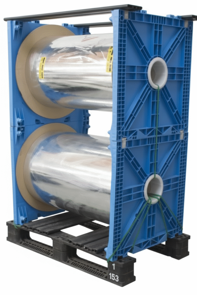 Diseñado a medida para la industria de bobinas de BOPP, este pallet innovador cuenta con laterales inyectados de diseño registrado, ofreciendo máxima estabilidad y protección. Con una capacidad de carga de hasta 4.000 kg, garantiza un transporte seguro y eficiente. Su estructura es 100% reutilizable y reciclable, alineándose con los estándares de sostenibilidad. Además, está preparado para soportar altas tensiones de sunchado, asegurando la integridad de las bobinas durante el almacenamiento y la logística. Se pueden utilizar sobre palets plásticos o de madera.
